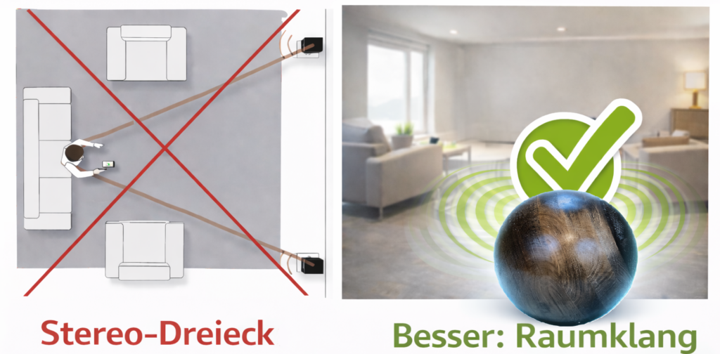 das klassische Stereodreieck – gleichseitiges Dreick zwischen Lautsprechern in Hörposition – ist nicht das Ziel.